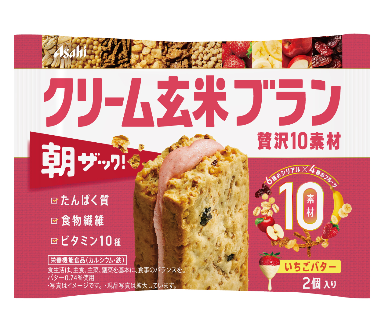 新商品は「クリーム玄米ブラン 贅沢10素材 いちごバター」「クリーム玄米ブラン贅沢10素材 ミルク」の2種。生地は6種のシリアルをベースに、「 いちごバター」には4種のフルーツ、「ミルク」 にはナッツを配合。 くちどけの良いサクサク感と素材のザクザク感が楽しめるという。