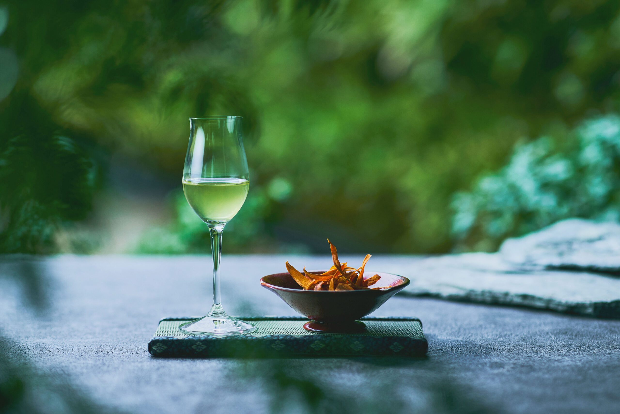 使うお茶を創業300年を超える京都の老舗一保堂茶舖製からセレ クト。ウェルカムドリンクに玉露「甘露」、 草木の姿を西洋ゴボウの素揚げで表現したというウェルカムデセー ルで客を迎える。