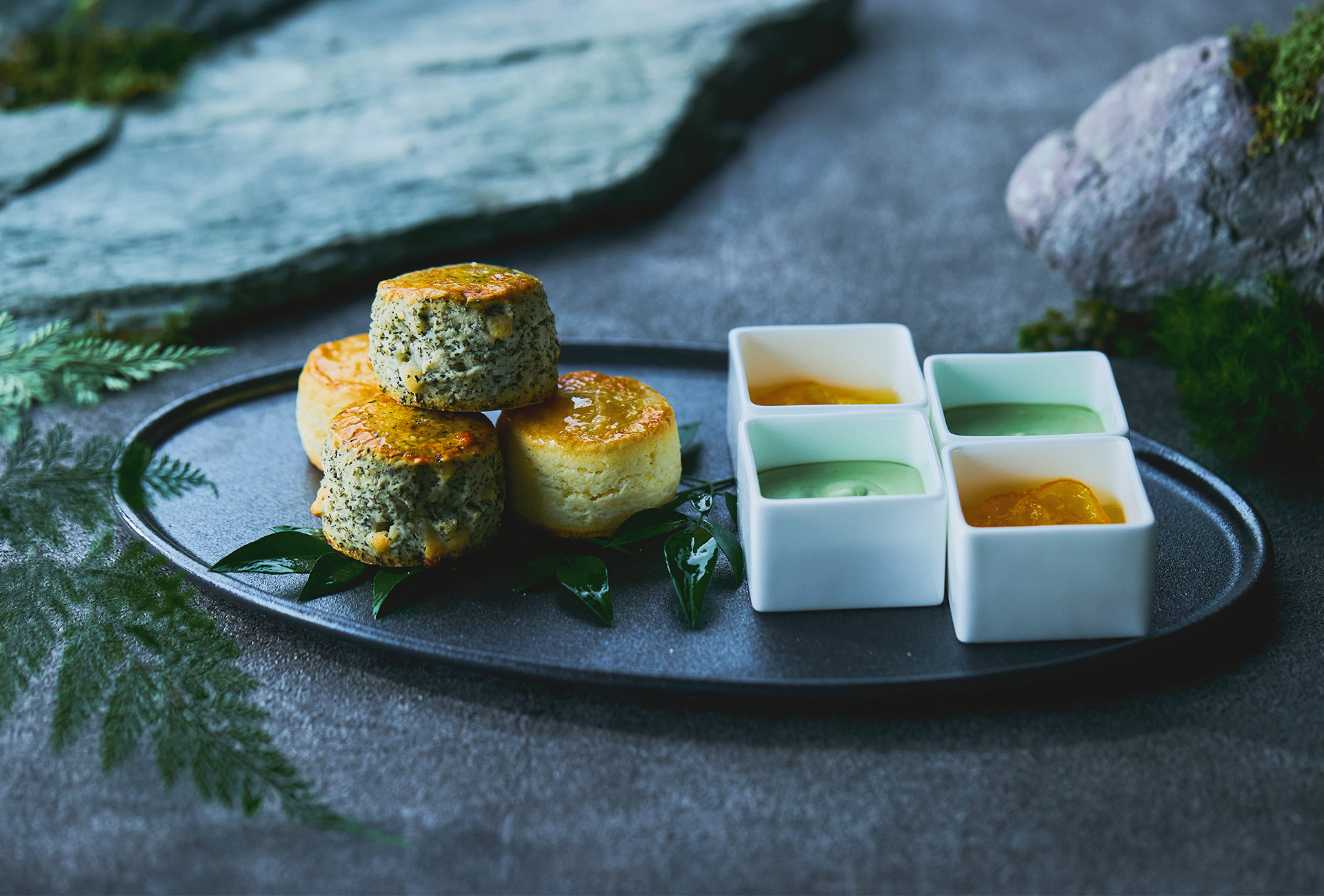 スイーツは抹茶を苔に見立てた苔玉ムース、煎茶入りのどら焼き、 ほうじ茶と抹茶の風味をそれぞれに混ぜ込んだみたらし団子など7 種。セイボリーは炒った玄米の食感を楽しめるキッシュ。 抹茶を混ぜ込んだ汲み上げ湯葉を仕上げにトッピングしたサラダ、 抹茶塩をかけて食べるサンドイッチの3種。このほか、 2種のスコーンを用意する。和紅茶や日本茶に加え、 コーヒーなど20種類以上のドリンク飲み放題が付く。