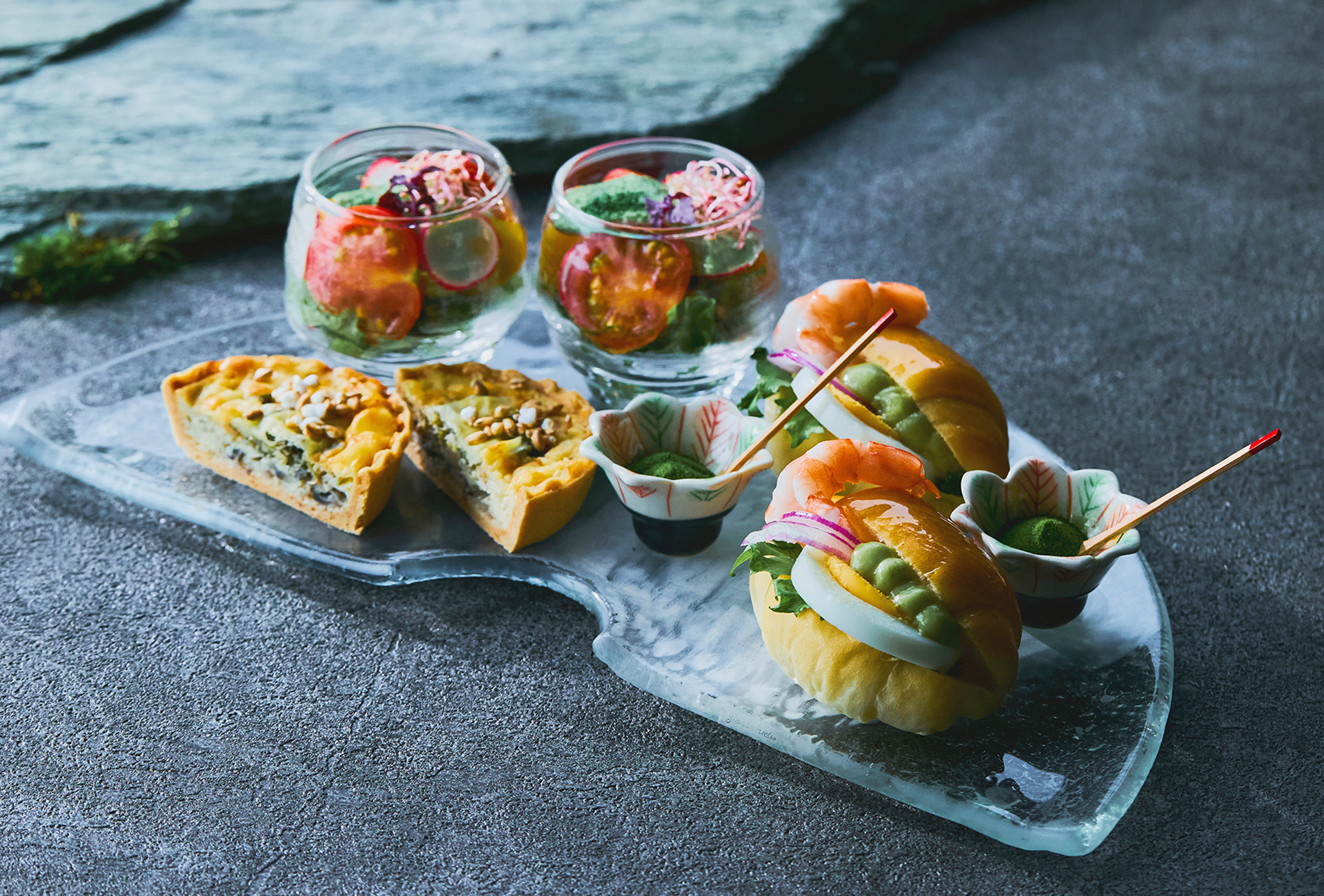 スイーツは抹茶を苔に見立てた苔玉ムース、煎茶入りのどら焼き、 ほうじ茶と抹茶の風味をそれぞれに混ぜ込んだみたらし団子など7 種。セイボリーは炒った玄米の食感を楽しめるキッシュ。 抹茶を混ぜ込んだ汲み上げ湯葉を仕上げにトッピングしたサラダ、 抹茶塩をかけて食べるサンドイッチの3種。このほか、 2種のスコーンを用意する。和紅茶や日本茶に加え、 コーヒーなど20種類以上のドリンク飲み放題が付く。
