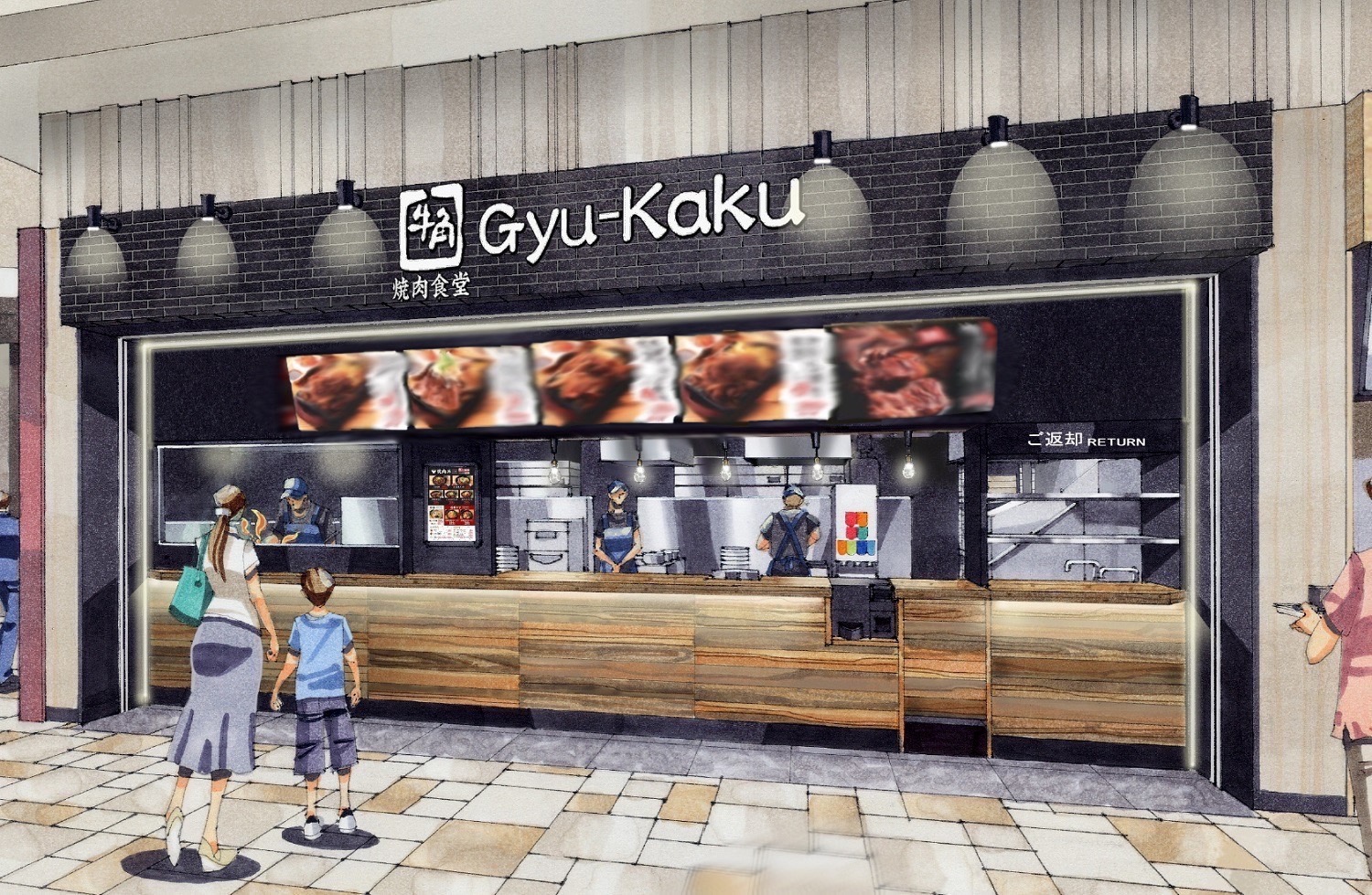 「牛角焼肉食堂」は牛角のフードコート業態で、近畿では8店目。 注文ごとに店内の鉄板で肉を焼くライブ感とシズル感を売りにして いる。
