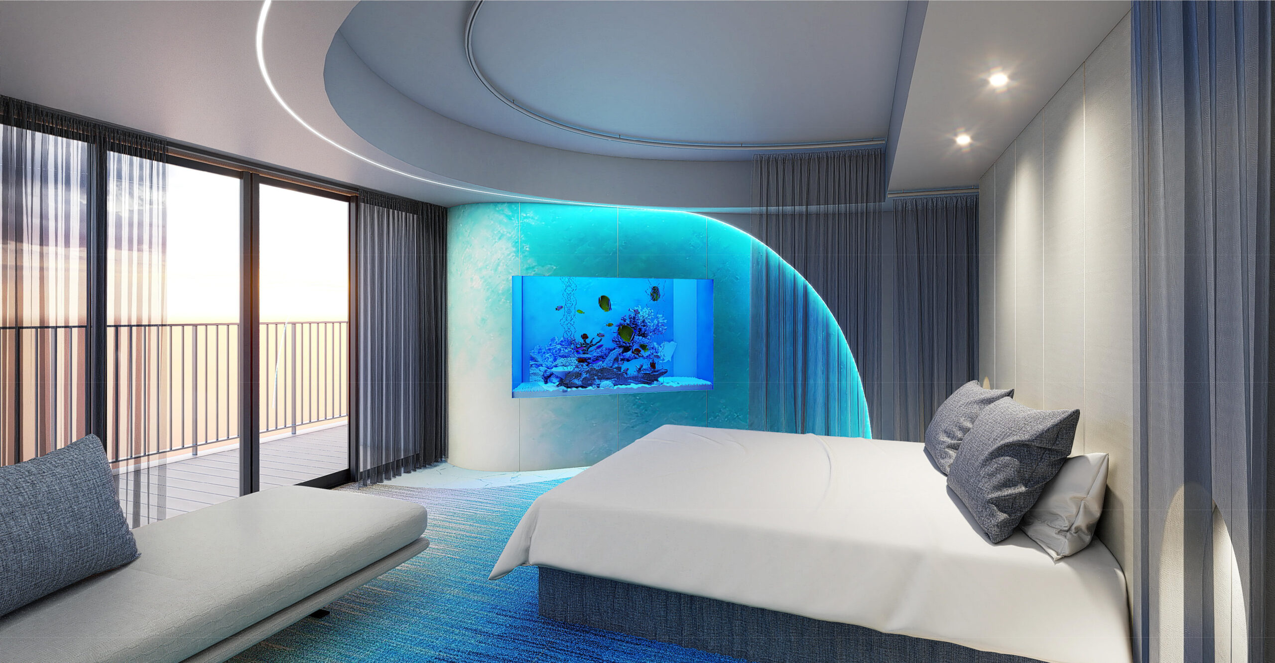 神戸須磨シーワールドホテルでは、イルカと触れ合える「 ドルフィンラグーン」を設置するほか、 大型の水槽が付いたプレミアムルームや、 瀬戸内海を一望できるバスを備えたルームなど特別ルームを用意す る。料金は1人2万5,500円~。